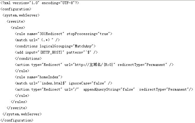然后就是基于windows平臺(tái)下的301重新定向。因?yàn)閣indows平臺(tái)下的IIS和Linux的平臺(tái)存在著一定的差別,對(duì)此需要和IDC供應(yīng)商進(jìn)行商討,了解基于windows平臺(tái)下的IIS配置。在windows平臺(tái)下,可以在根目錄下創(chuàng)建一個(gè)web.config文件,然后在這個(gè)文件中輸入下面的代碼,具體如下圖所示。